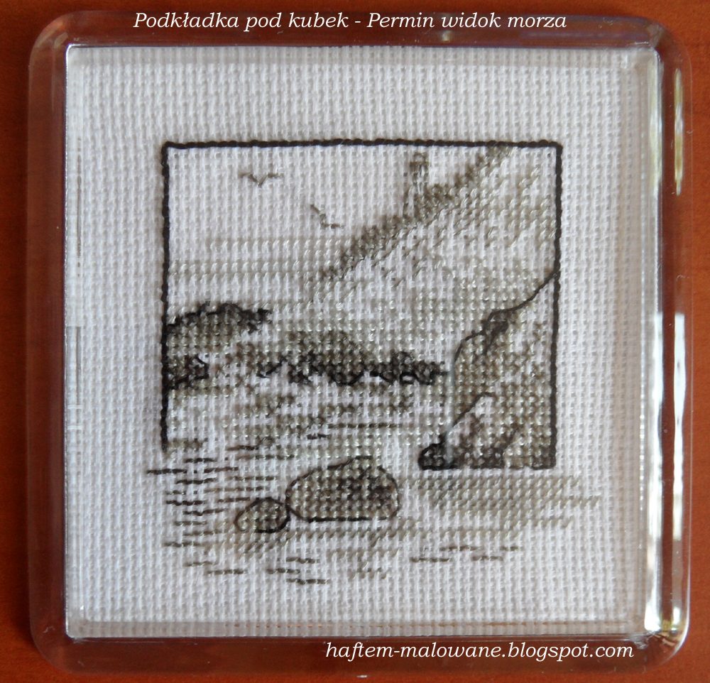 Przygotowałam kartkę haftem matematycznym, aniołka z masy solnej - który niestety pękł w transporcie, ale mam nadzieję, że da się go naprawić i podkładkę pod kubek z widoczkiem morskim z serii Permin.